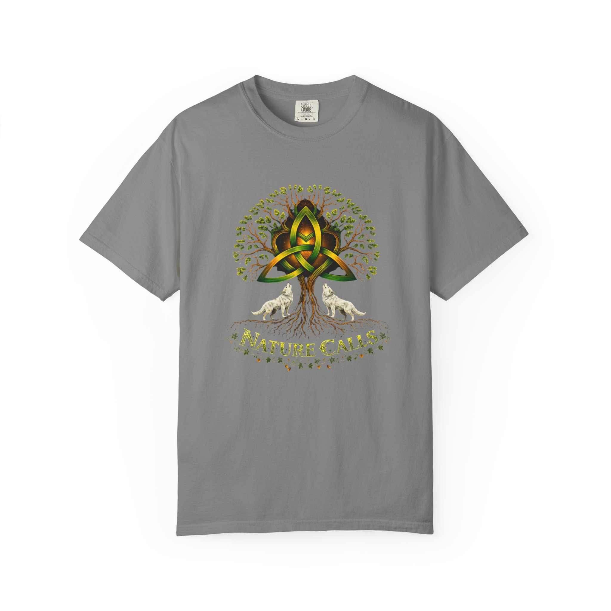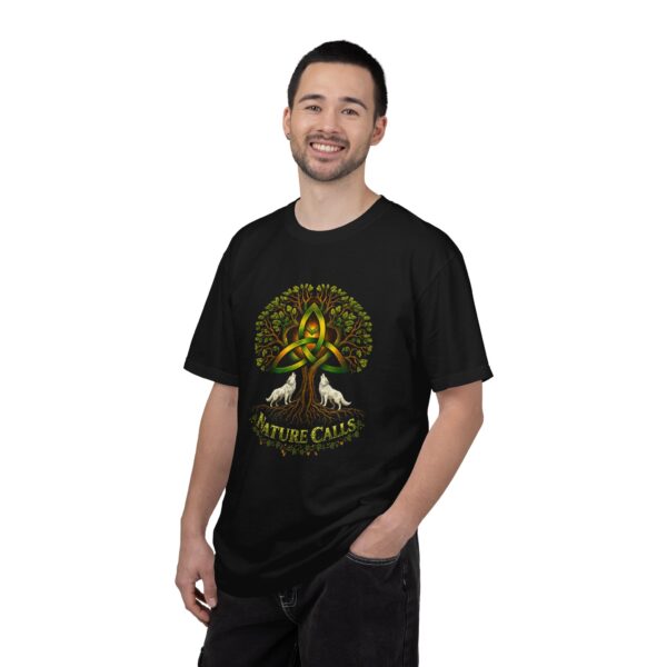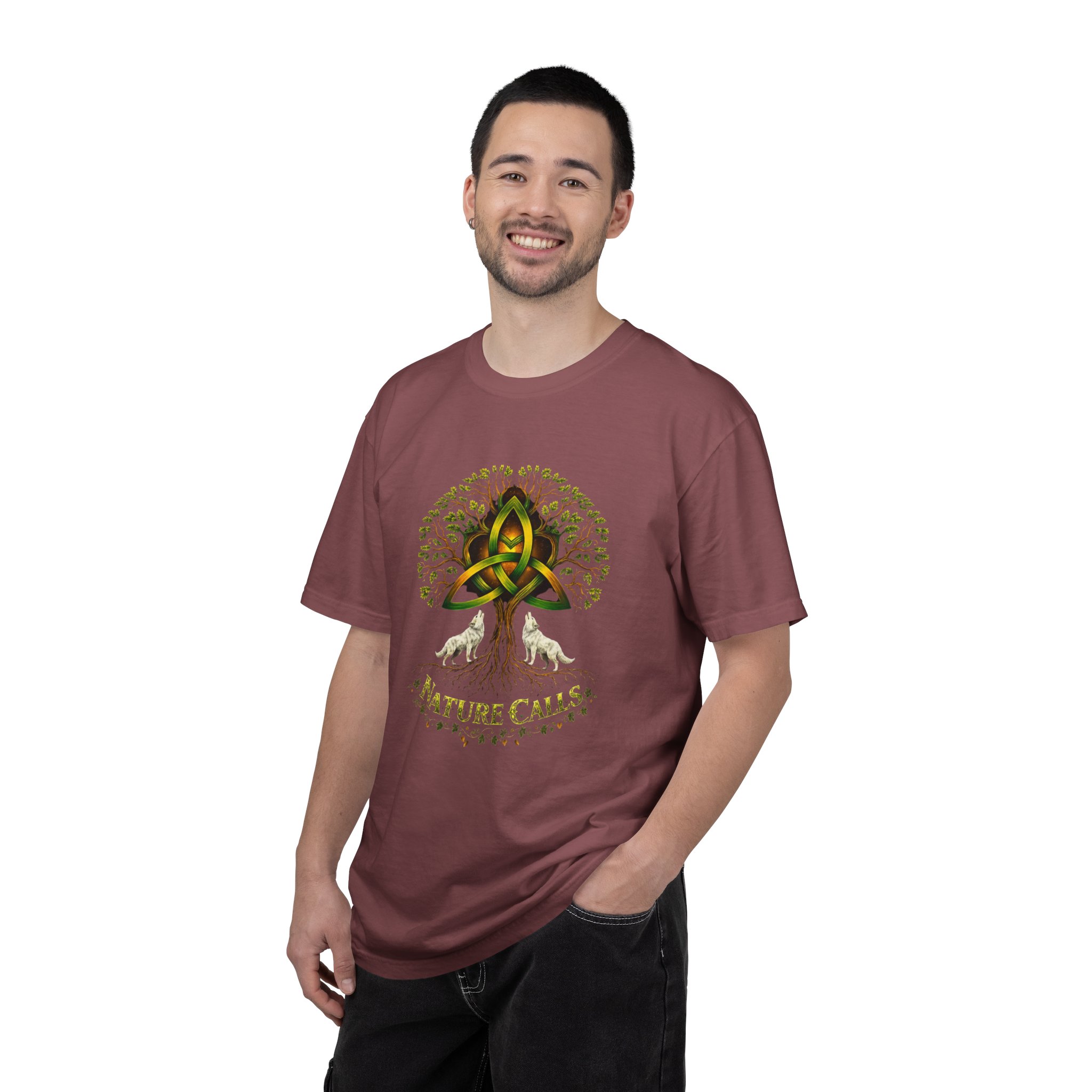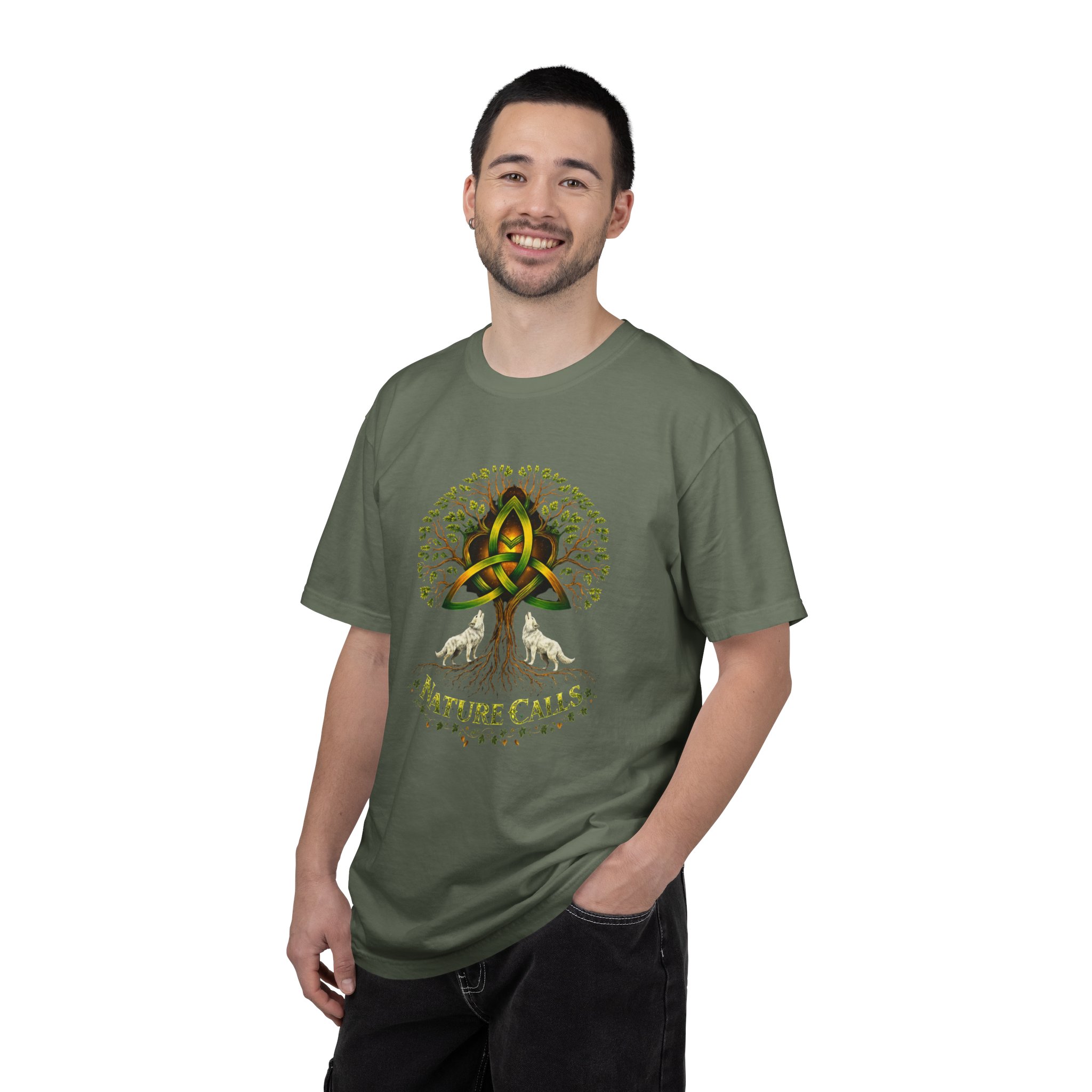 Een zacht katoenen T-shirt dat vanaf het eerste moment comfortabel aanvoelt. Op de voorkant staat een krachtige, door de natuur geïnspireerde illustratie: een Keltische knoop die het hart vormt van een wijdvertakte boom, geflankeerd door twee huilende wolven en de tekst “Nature Calls”.