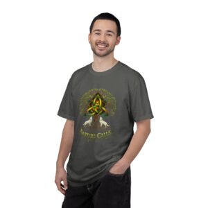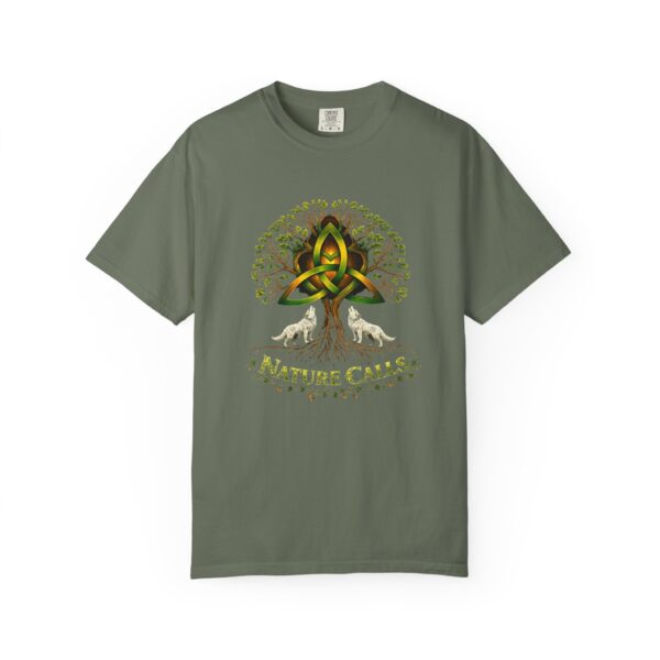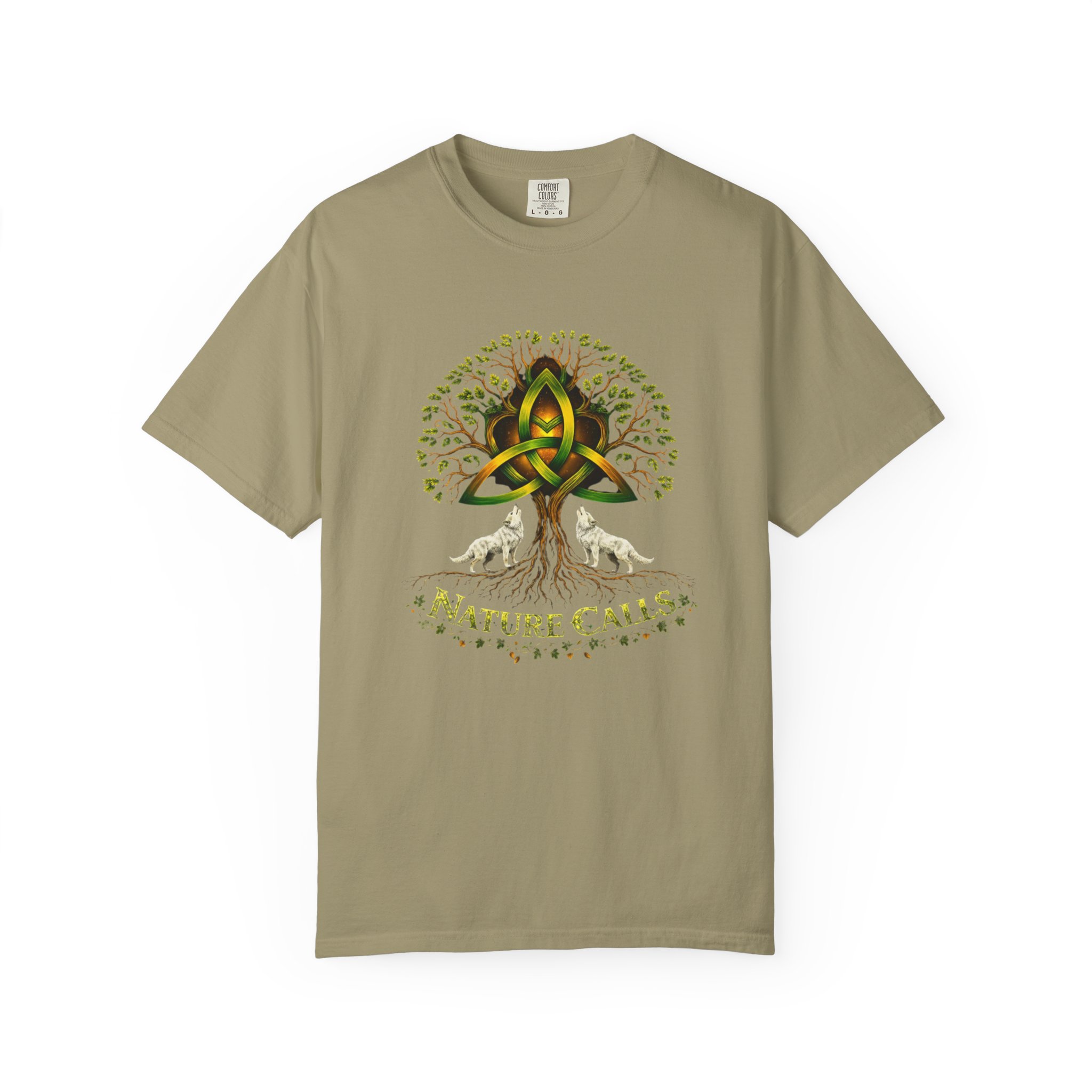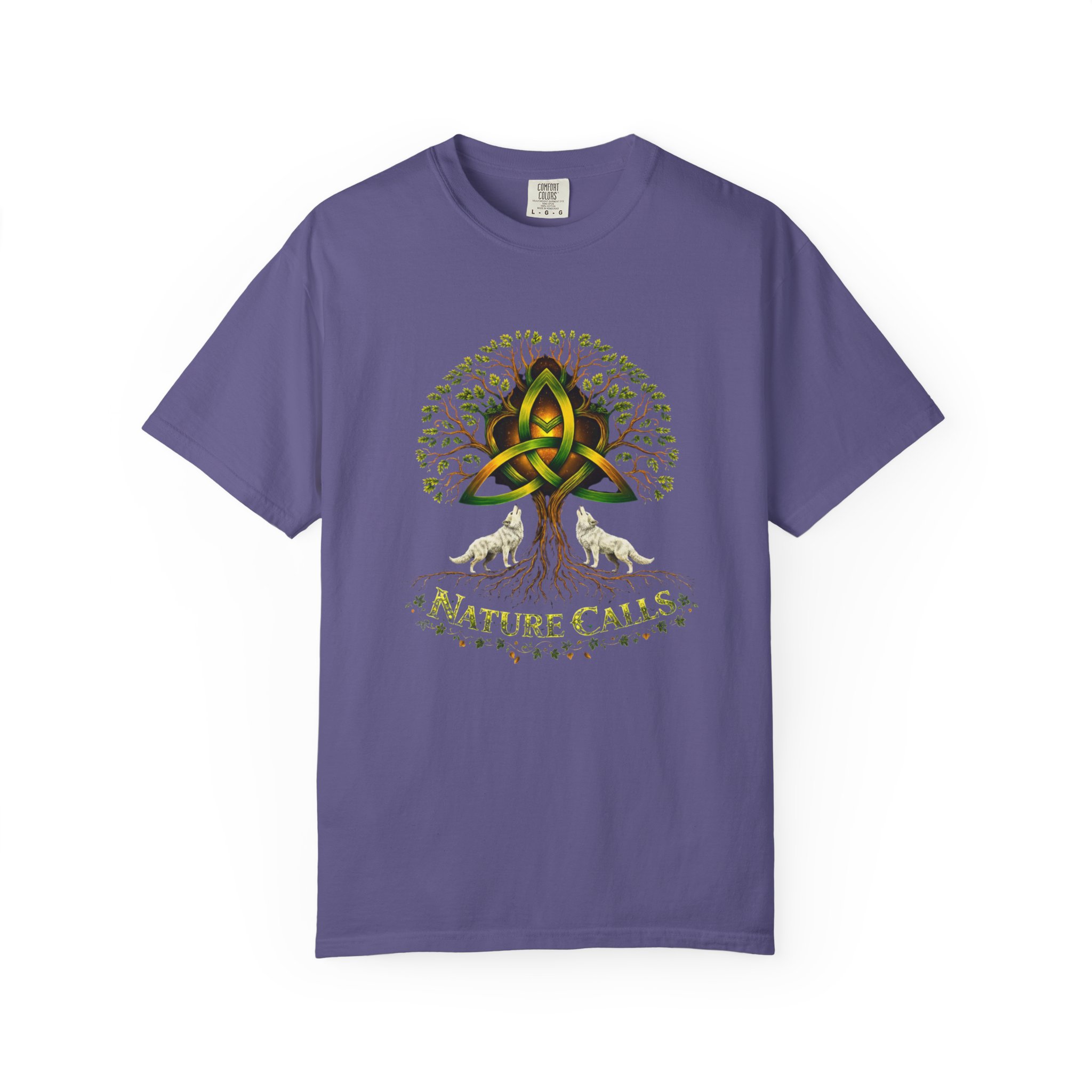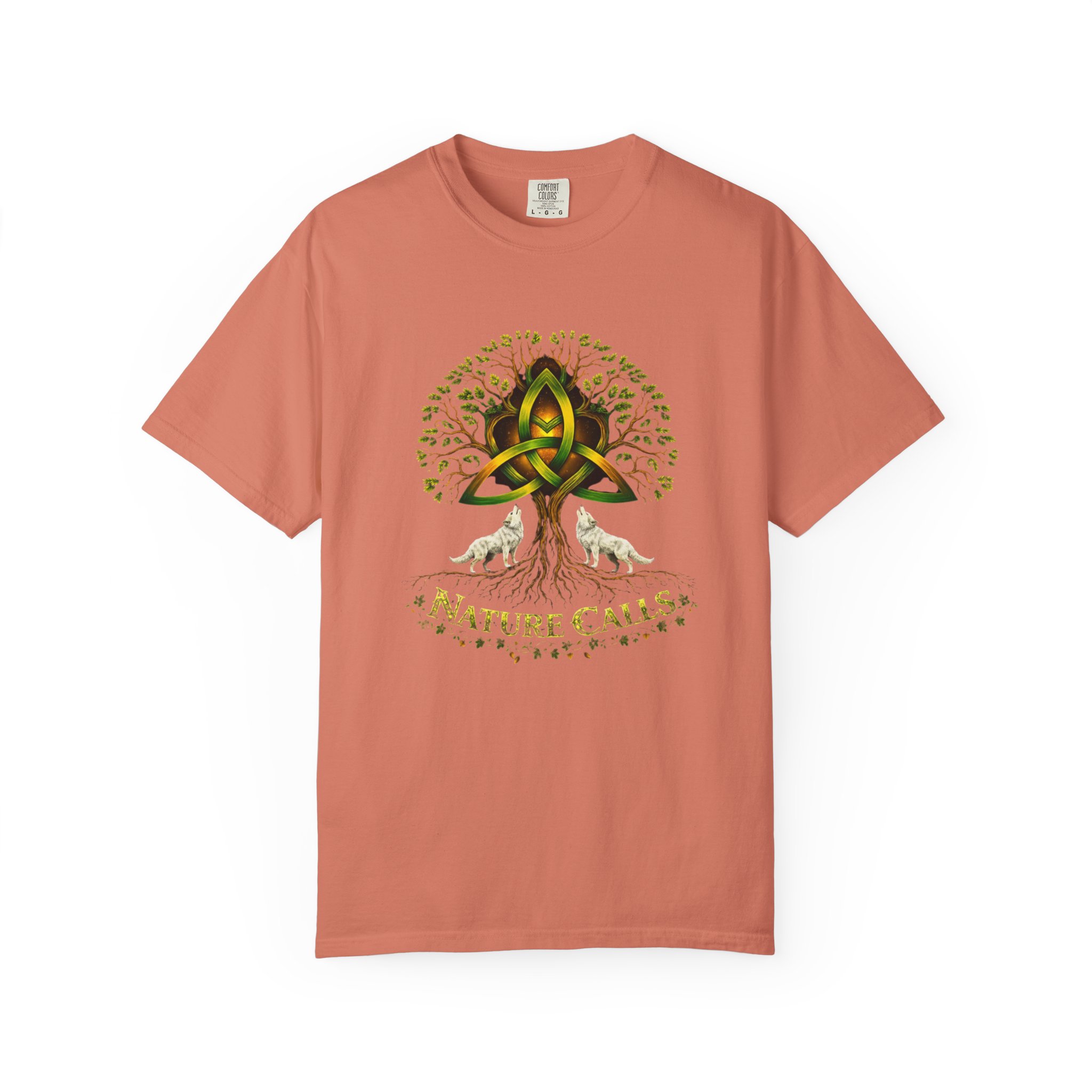 Een zacht katoenen T-shirt dat vanaf het eerste moment comfortabel aanvoelt. Op de voorkant staat een krachtige, door de natuur geïnspireerde illustratie: een Keltische knoop die het hart vormt van een wijdvertakte boom, geflankeerd door twee huilende wolven en de tekst “Nature Calls”.
