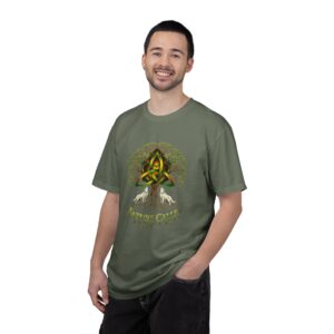 Beschrijving Een zacht katoenen T-shirt dat vanaf het eerste moment comfortabel aanvoelt. Op de voorkant staat een krachtige, door de natuur geïnspireerde illustratie: een Keltische knoop die het hart vormt van een wijdvertakte boom, geflankeerd door twee huilende wolven en de tekst “Nature Calls”. Het shirt is licht om te dragen maar voelt stevig aan. Het is na het maken geverfd, wat zorgt voor een zachte stof en een natuurlijke, licht vintage kleur. Het ring-gesponnen katoen houdt de details van de print scherp en helder, terwijl de kleur een warme, doorleefde diepte krijgt. Geschikt voor wandelingen in de natuur, momenten bij het vuur of gewoon voor elke dag — als stille ode aan bossen, symboliek en de wilde plekken die je weer laten landen.